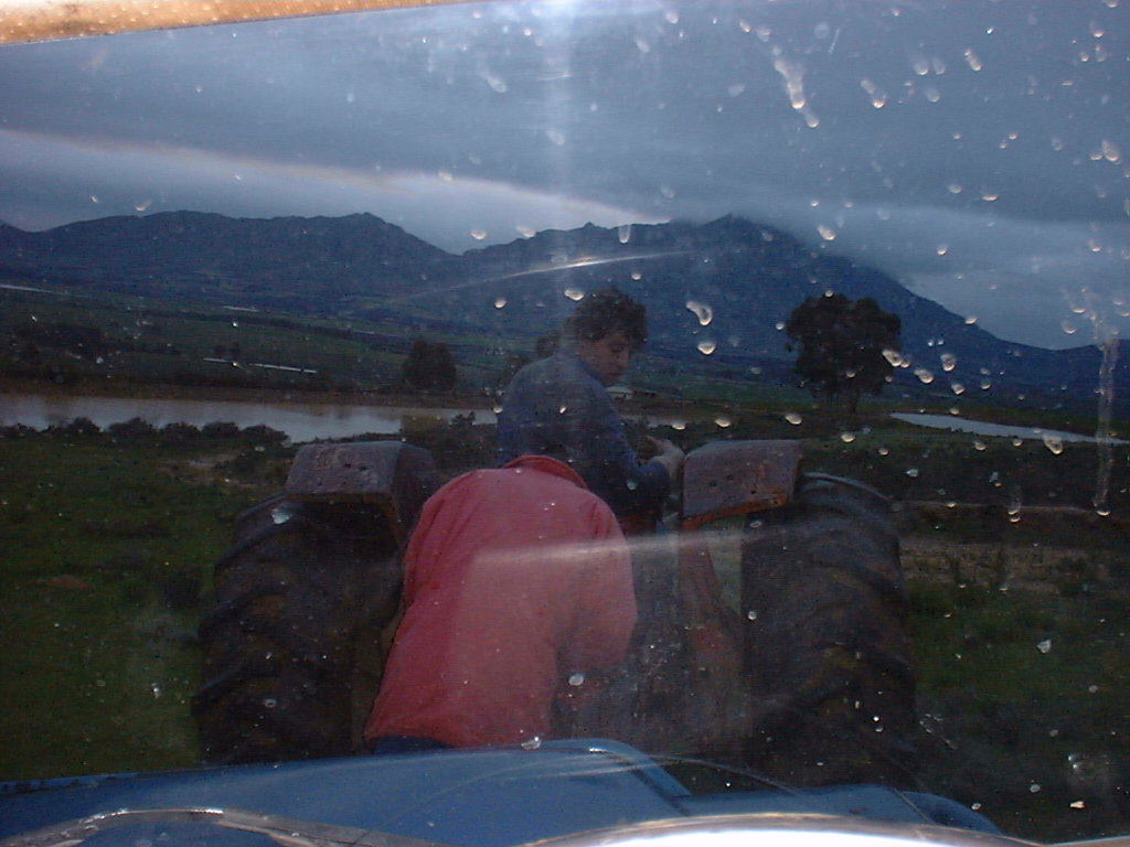 Once we got the worst of the problems fixed, it took several days to drive down to Tulbagh and we ran out of diesel a few times. The fuel gauges did not work, and we did not realise at the time, but fuel was draining from the rear tank. We slept in the vehicle on the way down. In figures 25 and 26 we see Maurice and Mike about to pull our Land Rover out of the mud with a tractor on their farm in the hills surrounding Tulbagh. The farm had extensive vineyards and a beautiful old farmhouse in the Cape Dutch style. The little town of Tulbagh had some fine cafes where you could sample the delights of milk tart, an Afrikaans speciality.