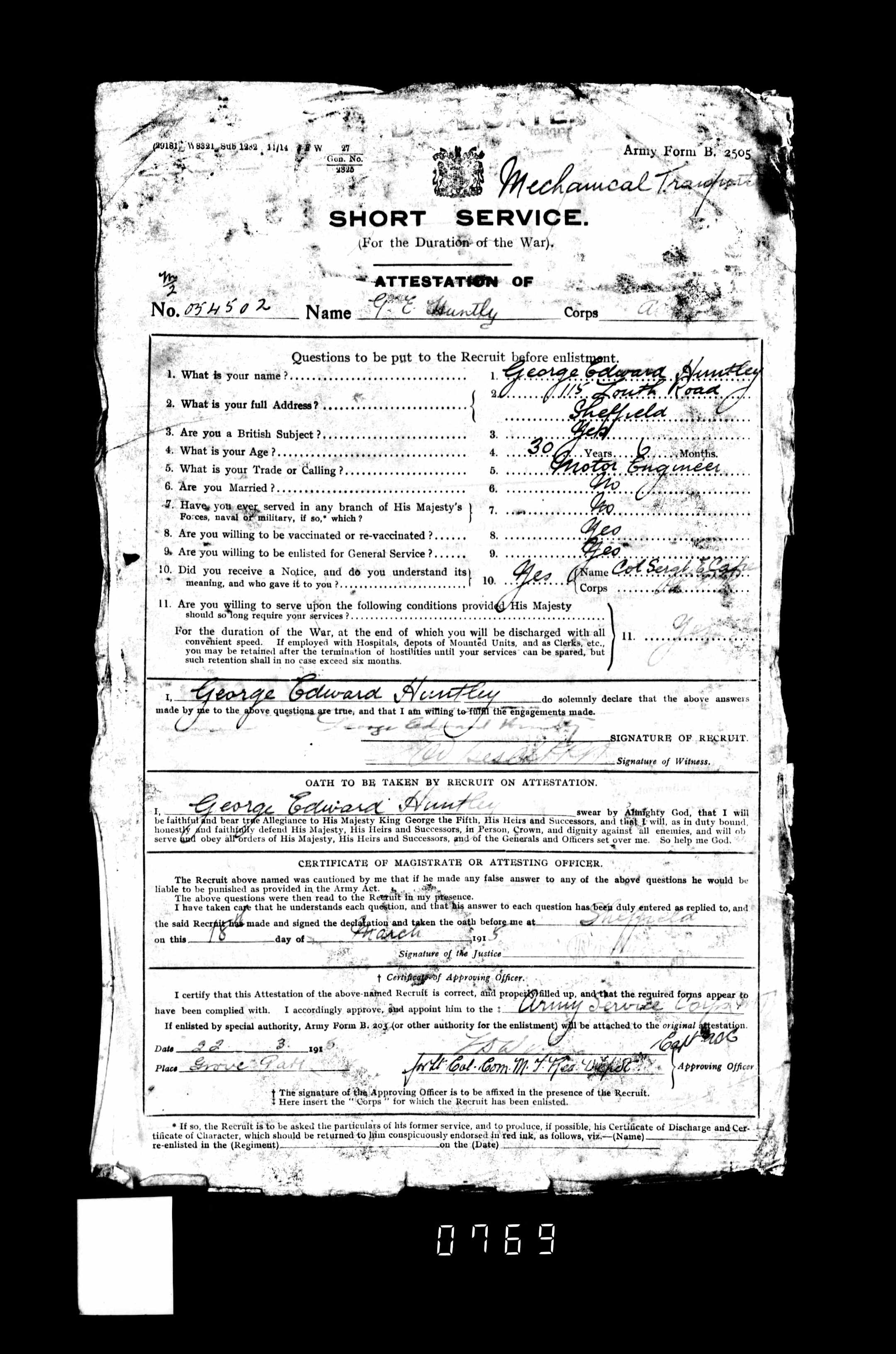Evidence of a Sgt G. E. Huntley in the First World WarIn this document, he is Second Lieutenant G. E. HuntleyFinally, his full name George Edward Huntley His medal index card and two addresses in SheffieldA match with the WW2 service number stated in my great-aunt’s note