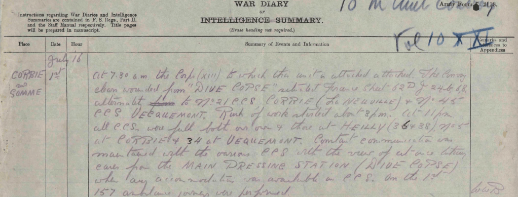 Here is the entry for 1st July 1916, the first day of the offensive. Many of the entries describe the number of journeys made, mileage, patients carried and other statistics. In this entry, it is reported that ambulances were transporting wounded and sick from the Main Dressing Stations (MDS) at Dive Copse, about ten miles behind the lines, to Casualty Clearing Stations (CCS) at Corbie, about 6 miles further back. There are constant complaints about the appalling state of the roads, lack of food for the men, the constant changing of personnel, and shortage of accommodation for the drivers.
