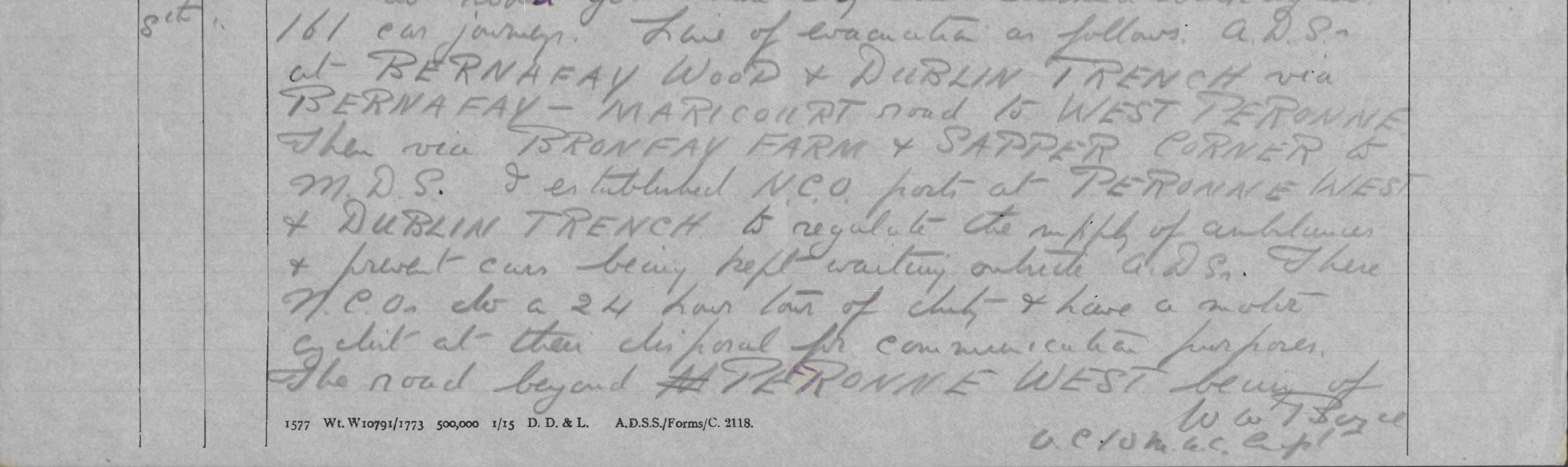 Description of the line of evacuation from the ADS at Bernafay Wood written 8th August 1916 by Captain W. W. Boyce.