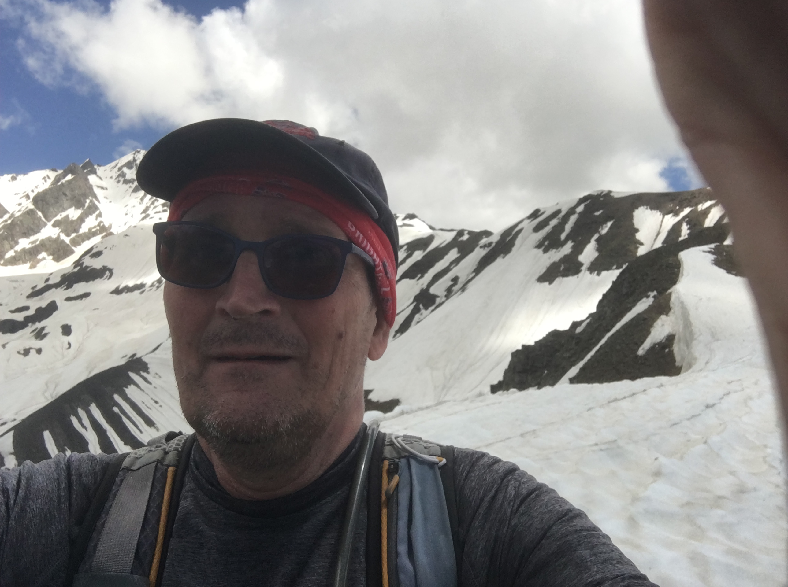 Snow-capped peaks with a wildflower meadow in the foreground.Yours truly at 3100 m negotiating a snow field in June.